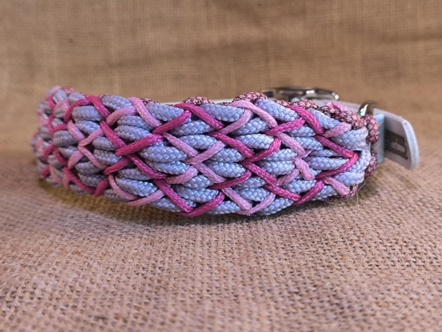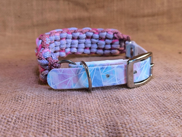 Son tressage lila se mêle à des touches de rose et de fushia. Ce collier est complété par une fermeture biothane imprimée aux couleurs pastels et au motif géométrique moderne.