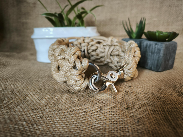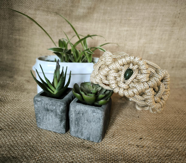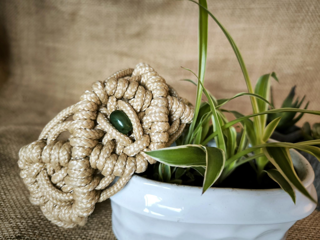 Son tressage aéré dans les tons beiges met en valeur une petite pierre verte au centre, symbole d’harmonie et de nature.